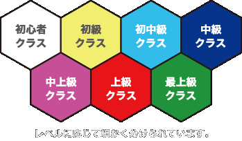でも、グリーンヒルズインドアテニススクールではこのような心配は不要です。なぜなら、当スクールのレッスンは、お客様のレベルにあわせて、初心者クラスから上級者クラスまで、7つのクラスをご用意し、お客様のレベルに合わせたコースをお選びいただけますので初心者の方も安心してレッスンが受講できるからです。